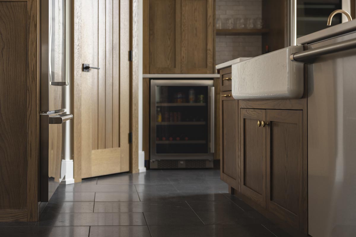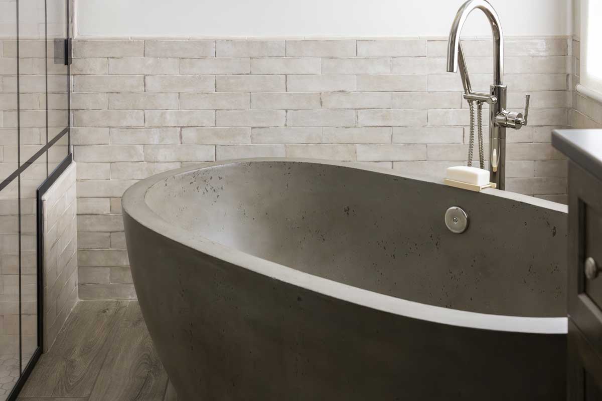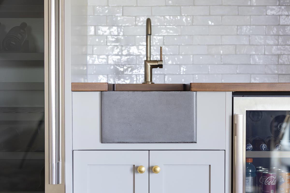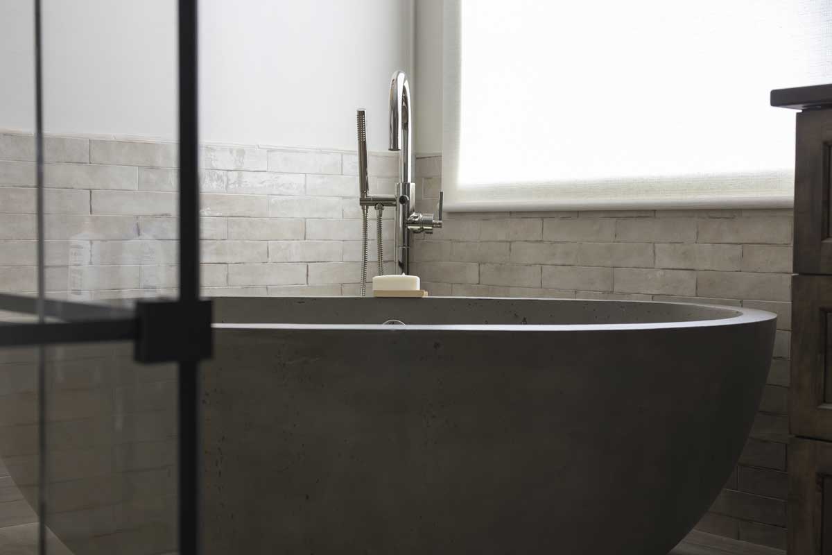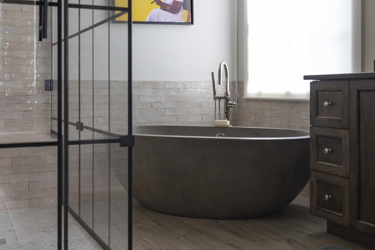 F.E. Trainer completed the whole home renovation of this Loudon County home in 2024. The residence blends modern and classic architectural styles with clean, contemporary interiors to achieve a bold and distinct look. Rustic materials were selected to surround the homeowners with beloved textures from the Rocky Mountains. Forged brass accents are used in the kitchen alongside oak cabinetry and floors. Rough-textured apron sinks in stone and firecrete mimic the trout rivers they frequent in Wyoming. A beautiful cast concrete soaking tub in the master bathroom is perfectly matched to wooden-style floor tiles and textured subway tiles. Forged steel doors and windows bring a primitive touch to rooms, along with large, exposed timber beams. Quarter-sawn white oak doors are another distinct feature of this renovation, as is the large window wall on the back of the house.