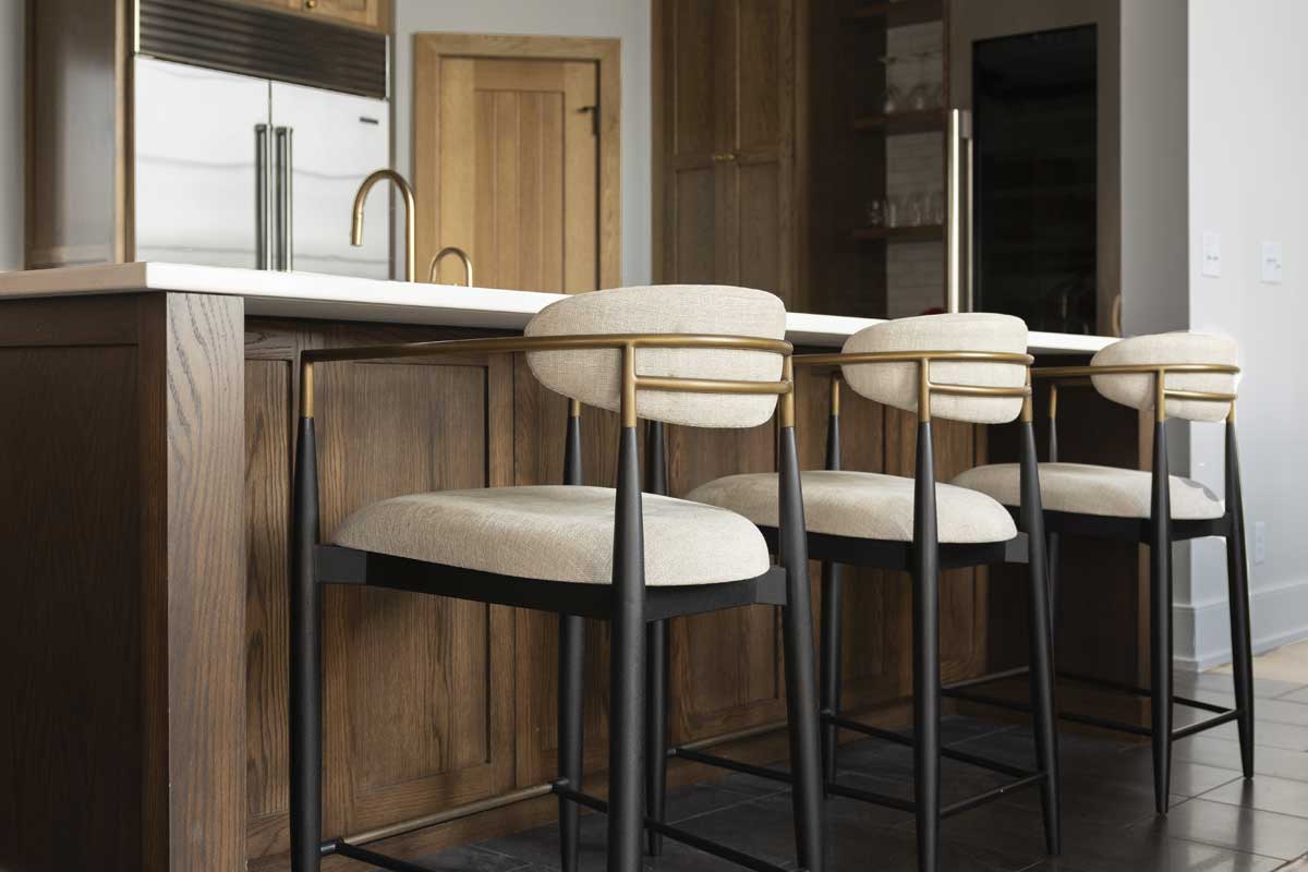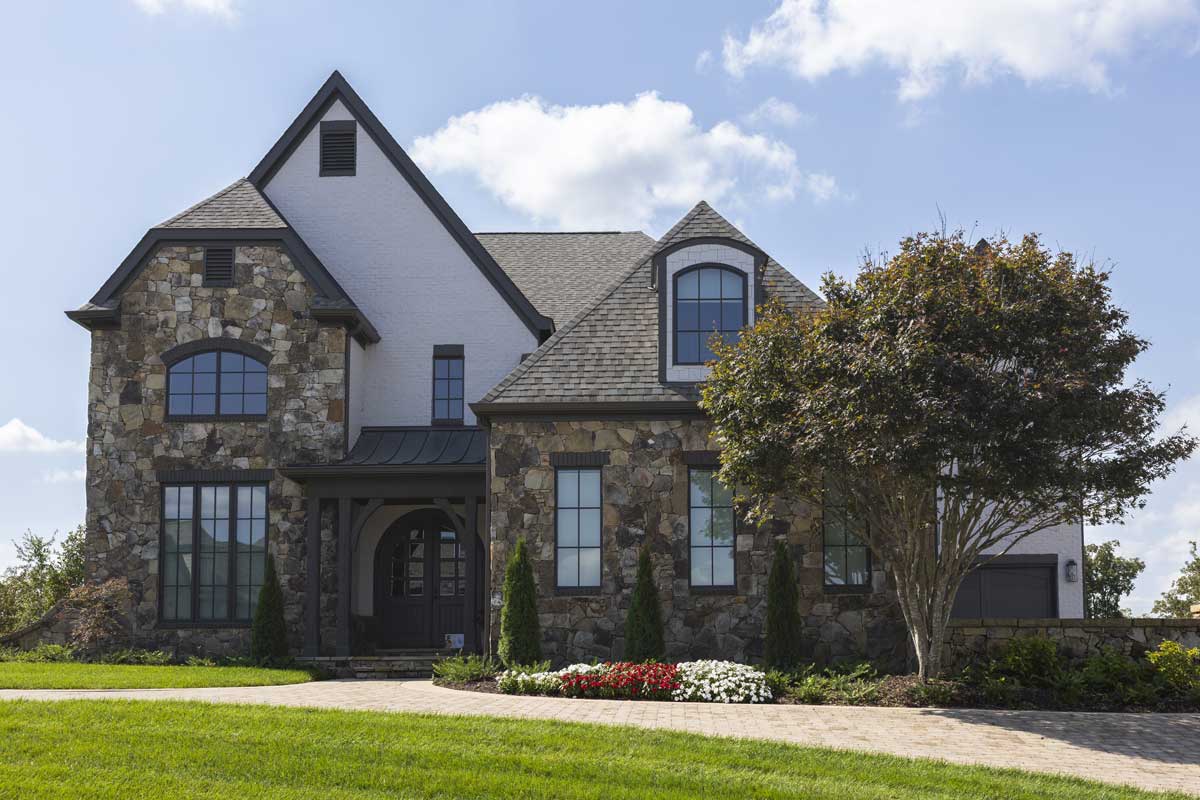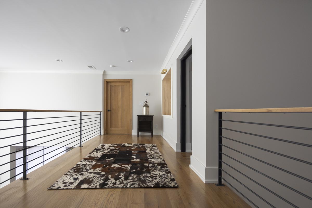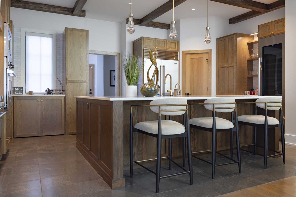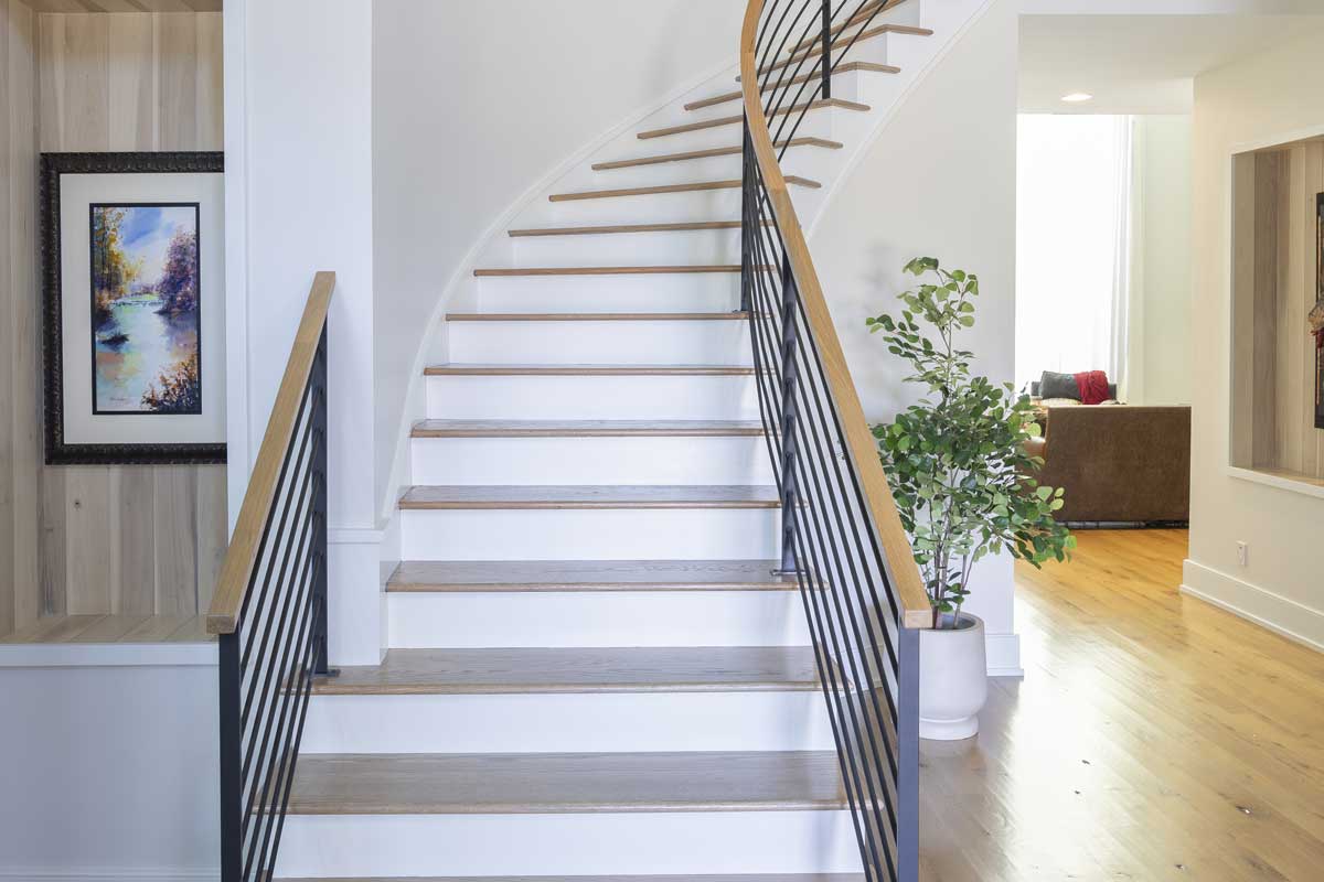 F.E. Trainer completed the whole home renovation of this Loudon County home in 2024. The residence blends modern and classic architectural styles with clean, contemporary interiors to achieve a bold and distinct look. Rustic materials were selected to surround the homeowners with beloved textures from the Rocky Mountains. Forged brass accents are used in the kitchen alongside oak cabinetry and floors. Rough-textured apron sinks in stone and firecrete mimic the trout rivers they frequent in Wyoming. A beautiful cast concrete soaking tub in the master bathroom is perfectly matched to wooden-style floor tiles and textured subway tiles. Forged steel doors and windows bring a primitive touch to rooms, along with large, exposed timber beams. Quarter-sawn white oak doors are another distinct feature of this renovation, as is the large window wall on the back of the house.