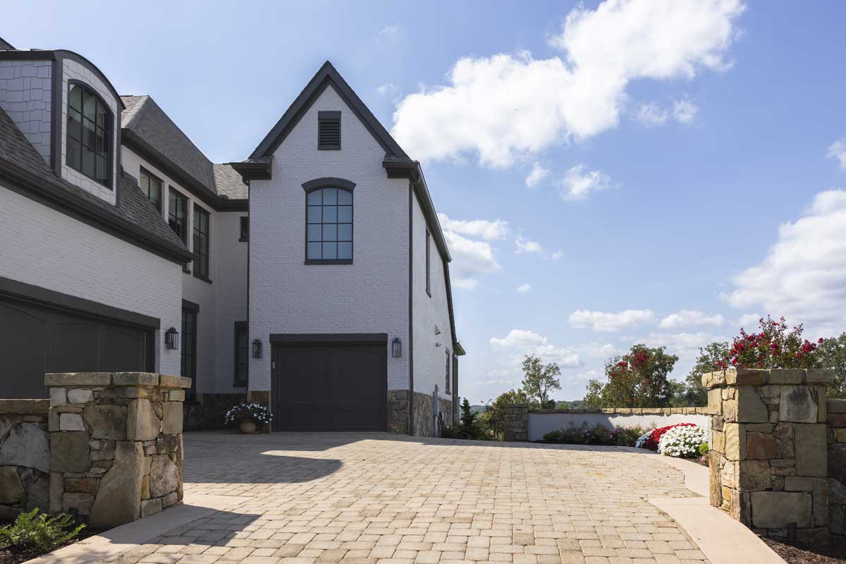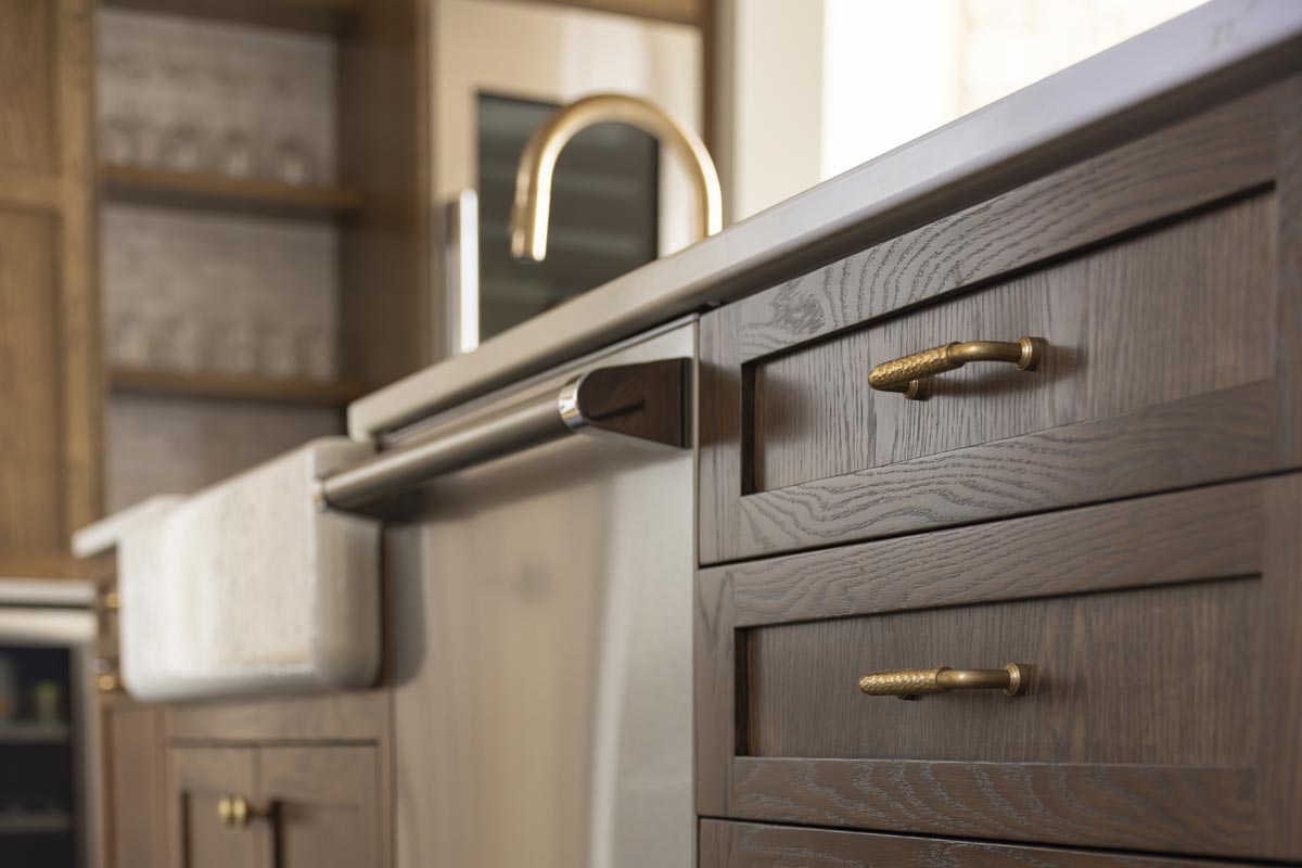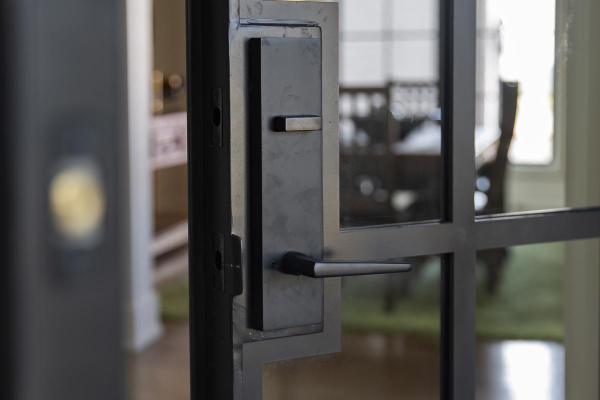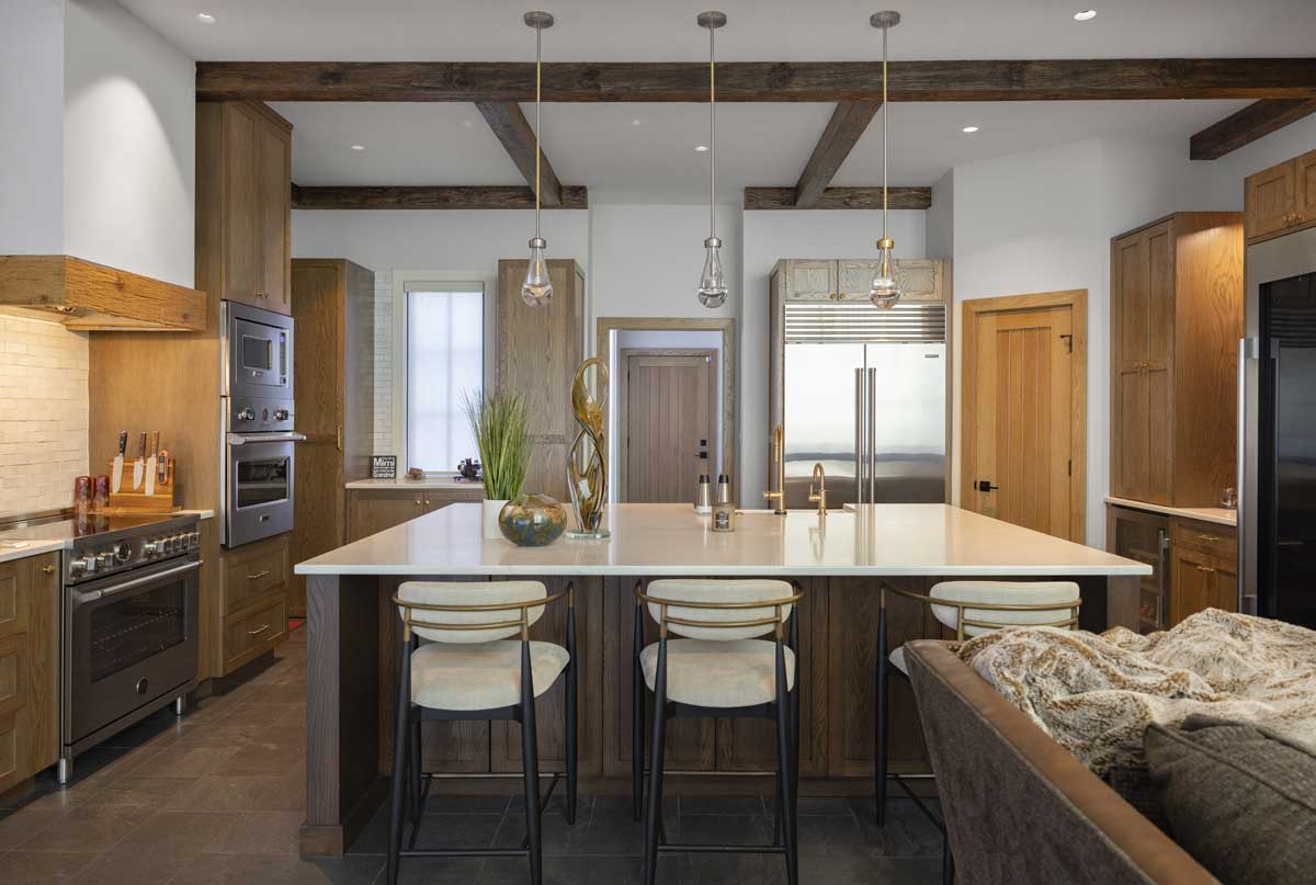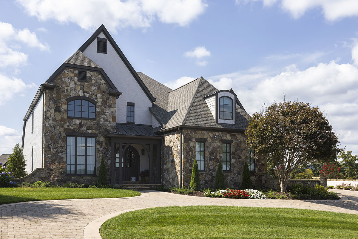 F.E. Trainer completed the whole home renovation of this Loudon County home in 2024. The residence blends modern and classic architectural styles with clean, contemporary interiors to achieve a bold and distinct look. Rustic materials were selected to surround the homeowners with beloved textures from the Rocky Mountains. Forged brass accents are used in the kitchen alongside oak cabinetry and floors. Rough-textured apron sinks in stone and firecrete mimic the trout rivers they frequent in Wyoming. A beautiful cast concrete soaking tub in the master bathroom is perfectly matched to wooden-style floor tiles and textured subway tiles. Forged steel doors and windows bring a primitive touch to rooms, along with large, exposed timber beams. Quarter-sawn white oak doors are another distinct feature of this renovation, as is the large window wall on the back of the house.
